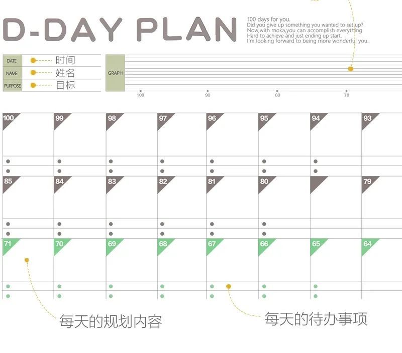 当你每天完成自己的学习任务之后,在表上打上一个勾,会给你带来一种非常大的成就感。同时也清晰地让你知道,离实现目标还有多远的距离,自己还要努力多少天。