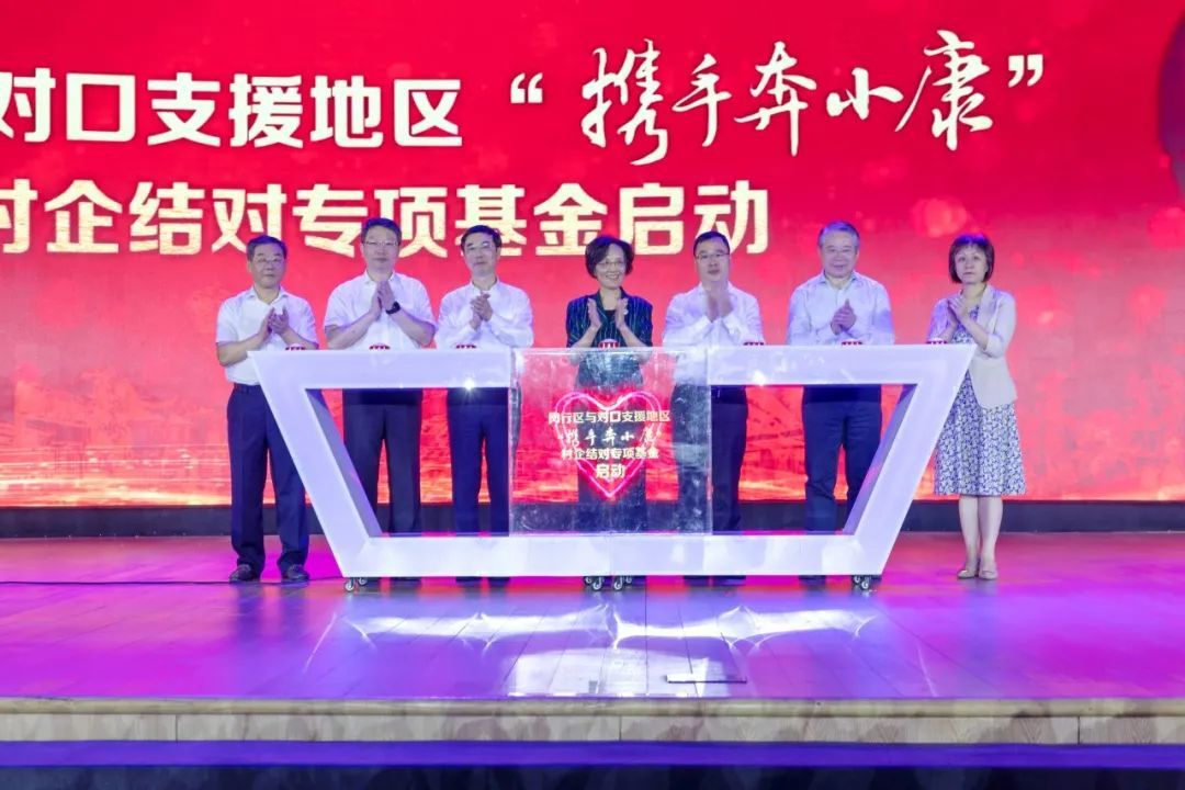 活动最后,钟燕群、陈宇剑、庞峻、祝学军、王观宝、吴志宏、刘艳等七位领导共同启动闵行区与对口支援地区“携手奔小康”村企结对专项基金。该基金旨在扎实有效地推进对口村企结对项目建设,使帮扶资金发挥效益,助力新疆泽普县、云南香格里拉市等贫困地区的脱贫攻坚工作。