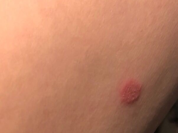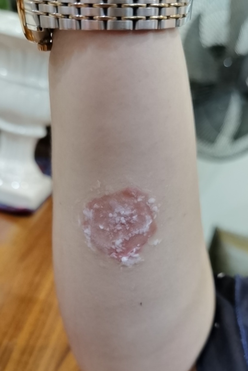 可以看到,她右手手臂的红斑直径有大约5cm,夜间奇痒无比。而小陈又患有荨麻疹,所以一抓皮肤,就会出现一条条的突起,继而变成风团。