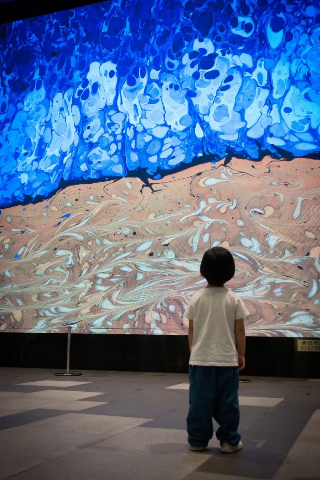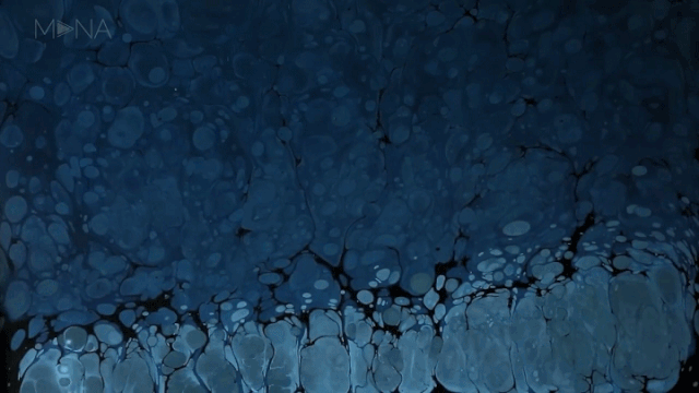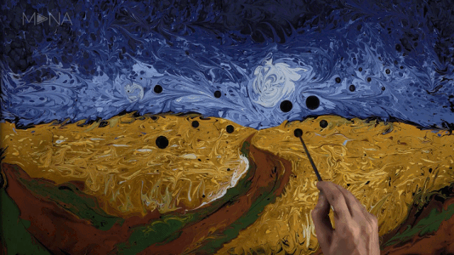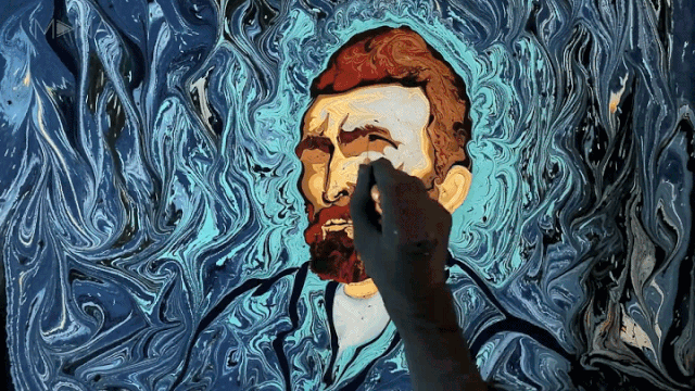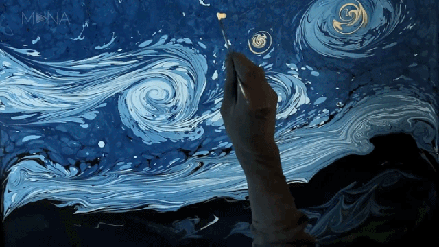 湿拓画,又称水画。颜料在水中绽放融合,纤细的笔杆在液体中舞动,绘就梵高的经典之作《星空》。