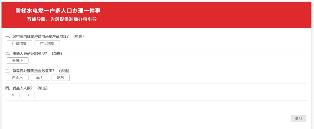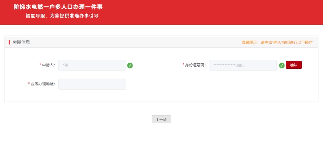 申请人通过户籍或房屋信息核验后,进行户号核验。用电申请只需输入户号,用水和用气申请需输入水务公司或燃气公司以及户号两个信息进行核验