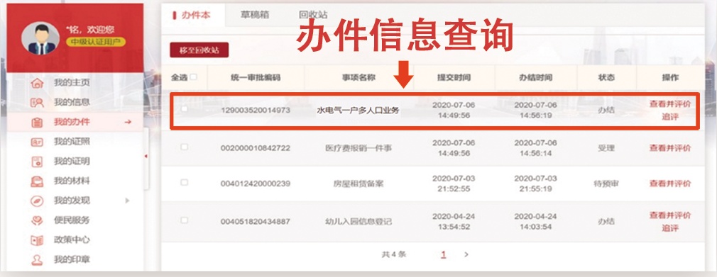 点击“提交”后,完成业务提交。客户可在“我的办件”中查询办理进度
