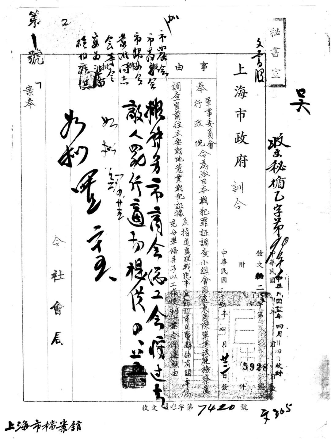1946年,上海市政府关于日本战犯罪证调查小组会同远东国际军事法庭检查处前往主要战地蒐汇战犯证据及指导处理战犯事宜所列之处应予以协助提供便利的训令(上海市档案馆藏)