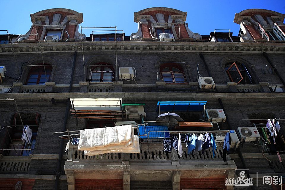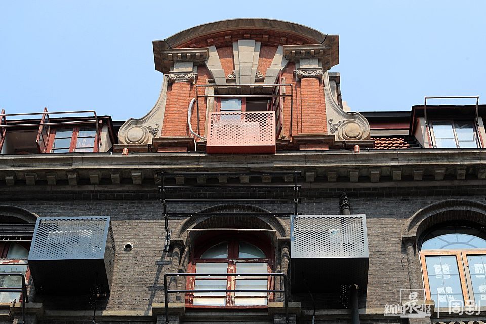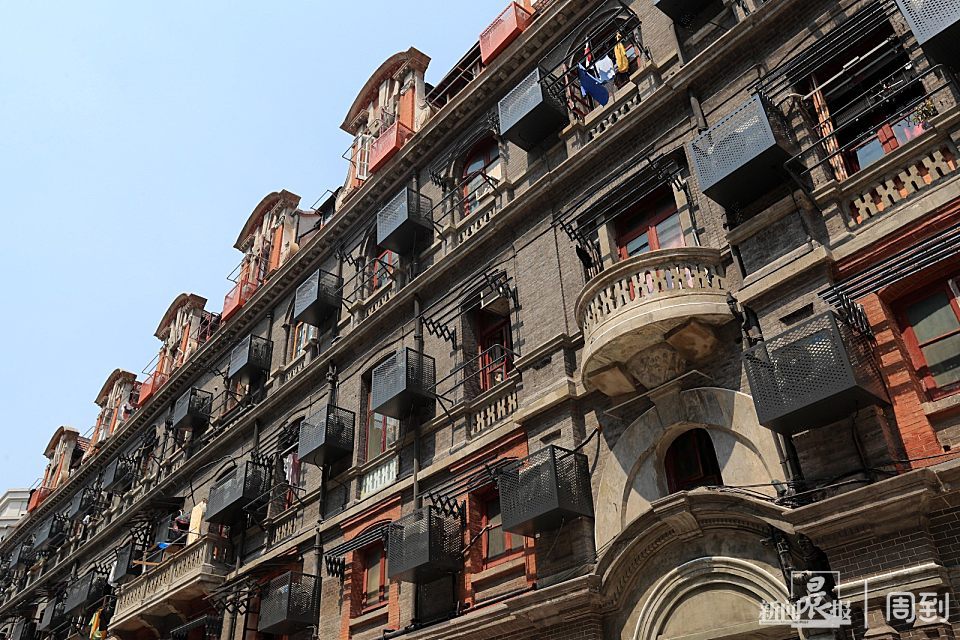 南京东路114号慈安里大楼,1906年竣工。法国文艺复兴风格,青砖墙面,立面局部采用古典装饰符号,屋顶老虎窗立面为巴洛克式。原本临街外立面密密麻麻地挂着空调外机,而且安装位置比较杂乱,大部分空调外机是直接裸露在外,另外晾衣架也是各式各样,与历史保护建筑很不协调。