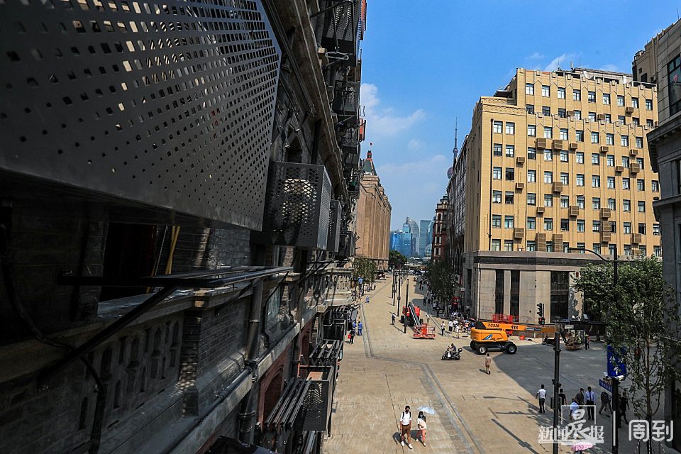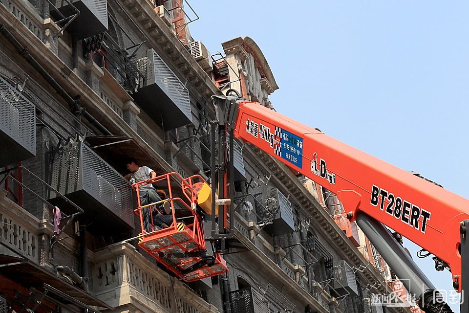 9月7日下午,南京路步行街东拓段慈安里大楼外立面空调室外机罩安装基本完成,工人们在升降机上加紧为居民安装晾衣架。