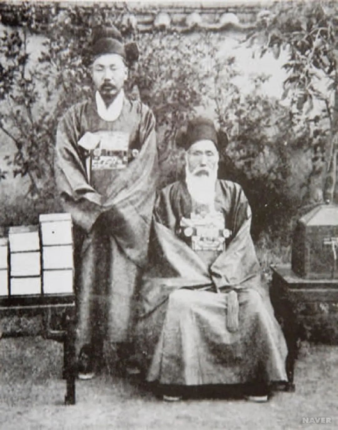 身着传统官服的金允植(右)