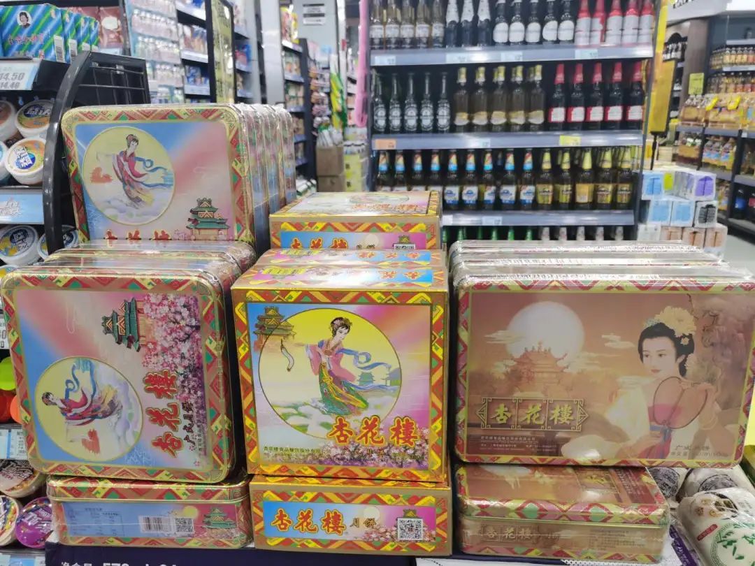 中秋节就要来了,各色月饼上市,在“一心玛特”超市入口处,杏花楼的两种广式传统月饼已摆上了最显眼的地方,有铁皮盒子的,也有纸盒装。