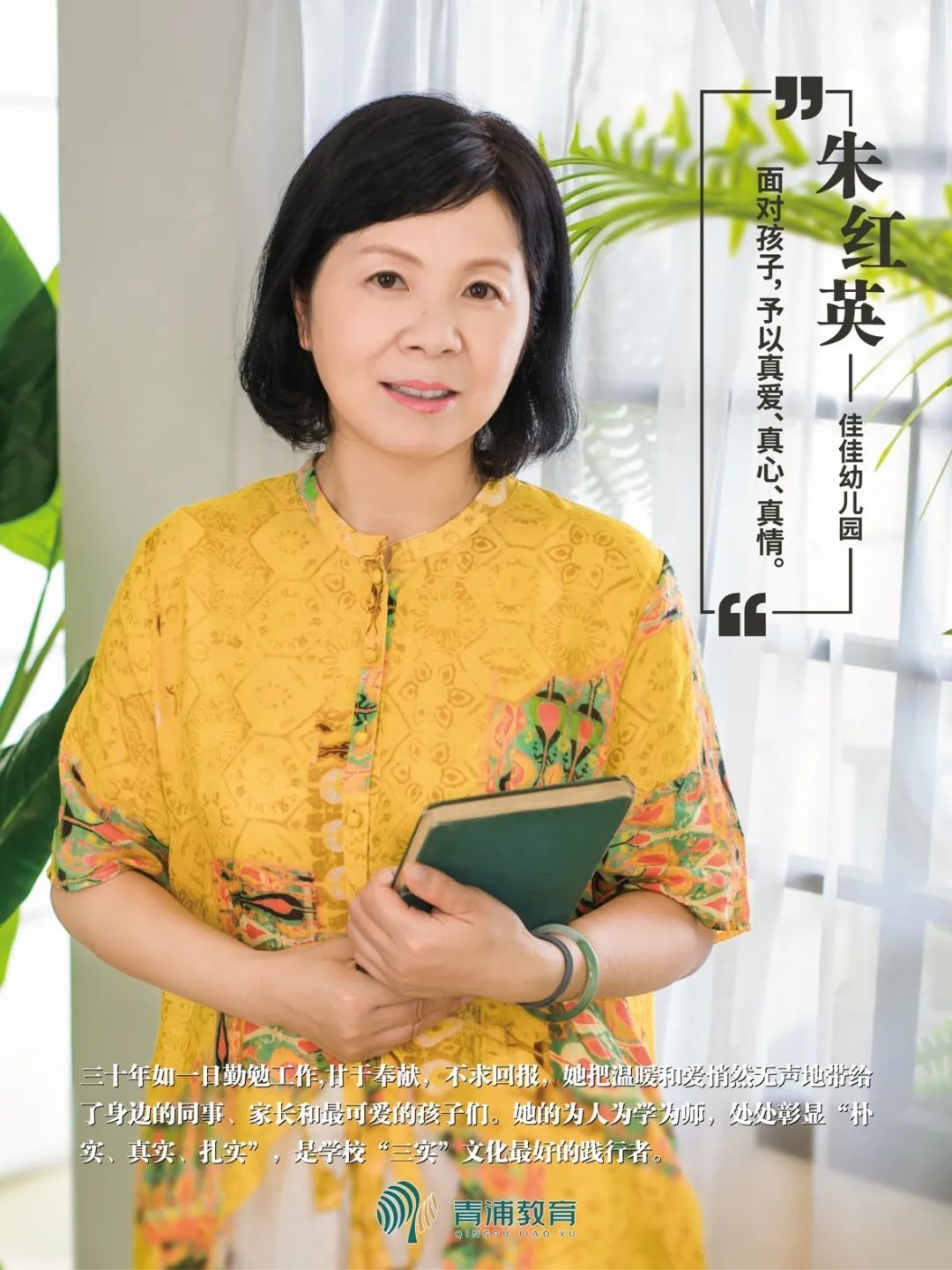 _ | 朱红英老师三十年如一日勤勉工作,甘于奉献,不求回报,她把温暖和爱悄然无声地带给了身边的同事、家长和最可爱的孩子们。她的为人为学为师,处处彰显“朴实、真实、扎实”,是学校“三实”文化最好的践行者。曾荣获青浦区课堂教学改进经验与案例征文“一等奖”,区早期教育指导中心“优秀学员”,多次荣获区行政记功。 | _ |