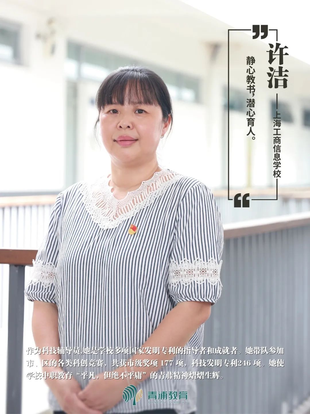 _ | 许洁老师作为科技辅导员,是学校多项国家发明专利的指导者和成就者。她带队参加市、区的各类科创竞赛,共获市级奖项177项,科技发明专利246项。她使学校中职教育“平凡,但绝不平庸”的青藤精神熠熠生辉。曾荣获上海市中等职业学校“优秀班主任”、青浦区名优教师“示范教师”、青浦区教育系统“青藤奖”。 | _ |