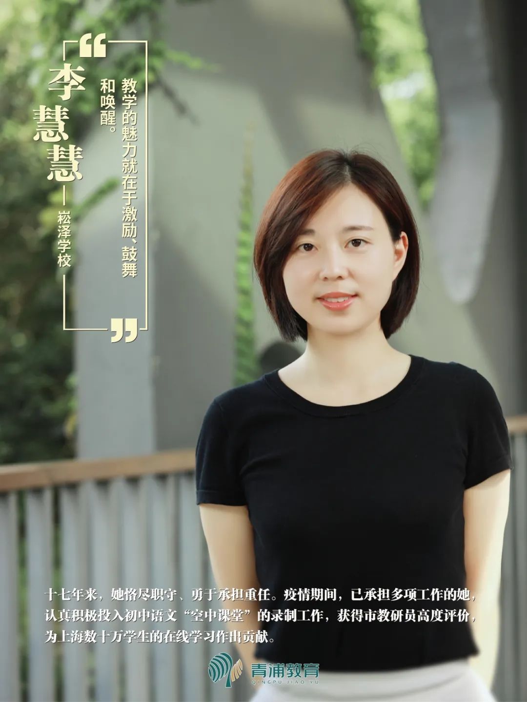 _ | 十七年来,李慧慧老师恪尽职守、勇于承担重任。疫情期间,已承担多项工作的她,认真积极投入初中语文“空中课堂”的录制工作,获得市教研员高度评价,为上海数十万学生的在线学习作出贡献。曾荣获上海市教育系统“巾帼建功标兵”、上海市教育系统“三八红旗手”、青浦区名优教师“学科带头人”。 | _ |