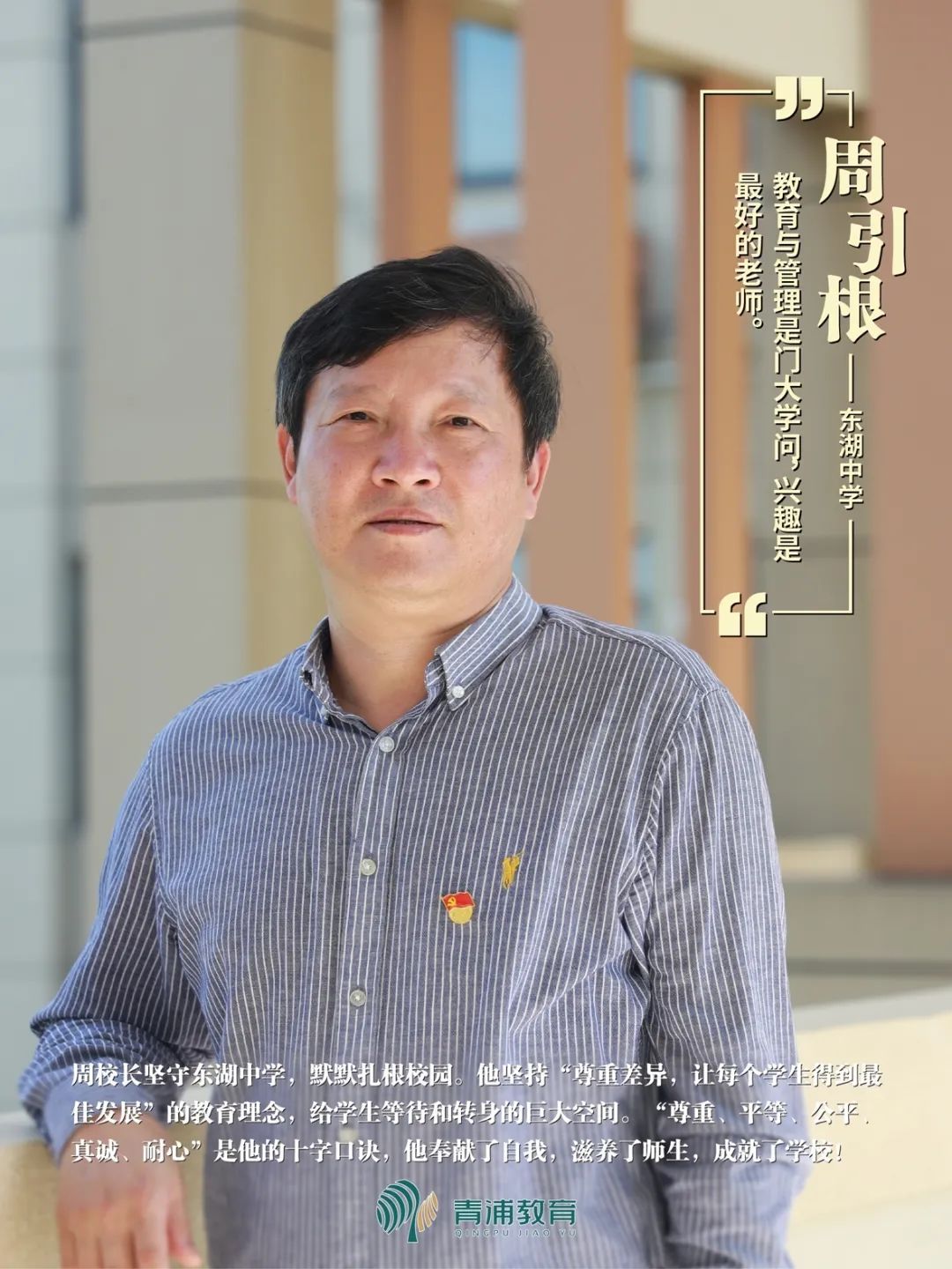 _ | 周引根校长坚守东湖中学,默默扎根校园。他坚持“尊重差异,让每个学生得到最佳发展”的教育理念,给学生等待和转身的巨大空间。“尊重、平等、公平、真诚、耐心”是他的十字口诀,他奉献了自我,滋养了师生,成就了学校!曾荣获青浦区和上海市“园丁奖”。 | _ |