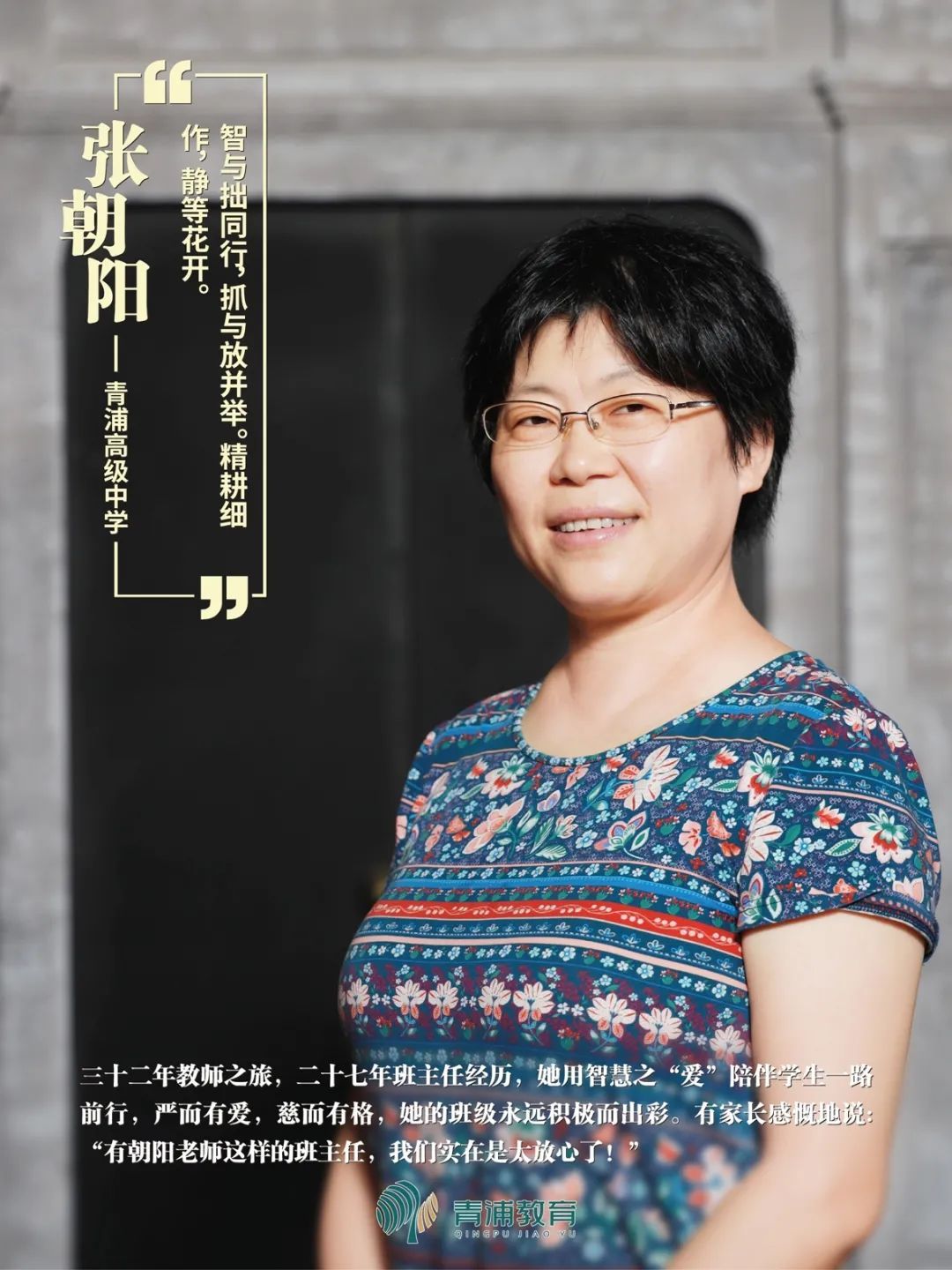 _ | 32年教师之旅,27年班主任经历,张朝阳老师用智慧之“爱”陪伴学生一路前行,严而有爱,慈而有格,她的班级永远积极而出彩。有家长感慨地说:“有朝阳老师这样的班主任,我们实在是太放心了!”曾荣获上海市“园丁奖”、青浦区春晖奖“十佳班主任”、青浦区名优教师“学科带头人”。 | _ |
