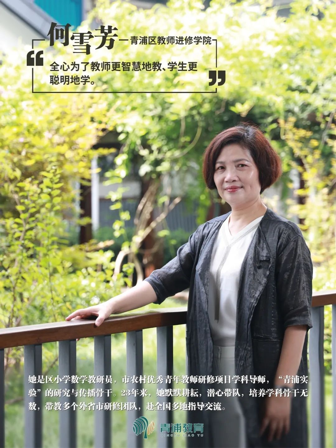 _ | 何雪芳老师是区小学数学教研员,市农村优秀青年教师研修项目学科导师,“青浦实验”的研究与传播骨干。23年来,她默默耕耘,潜心带队,培养学科骨干无数,带教多个外省市研修团队,赴全国多地进行指导交流。曾荣获上海市“昂立育才奖”、行政记大功、青浦区名优教师“学科带头人”。 | _ |