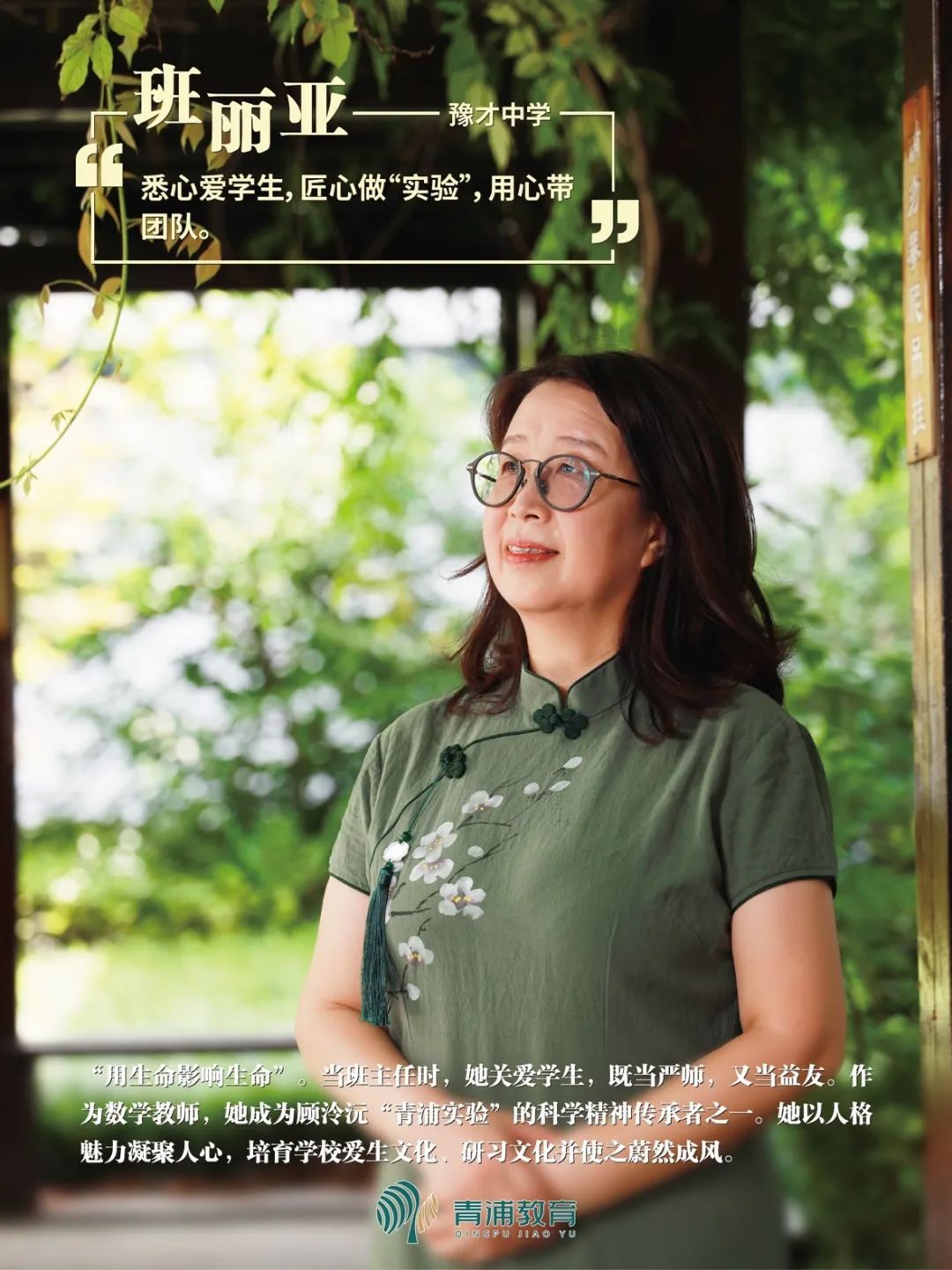_ | “用生命影响生命”。当班主任时,班丽亚老师关爱学生,既当严师,又当益友。作为数学教师,她成为顾泠沅“青浦实验”的科学精神传承者之一。她以人格魅力凝聚人心,培育学校爱生文化、研习文化并使之蔚然成风。曾荣获上海市“园丁奖”、行政记大功、青浦区名优教师“学科带头人”。 | _ |