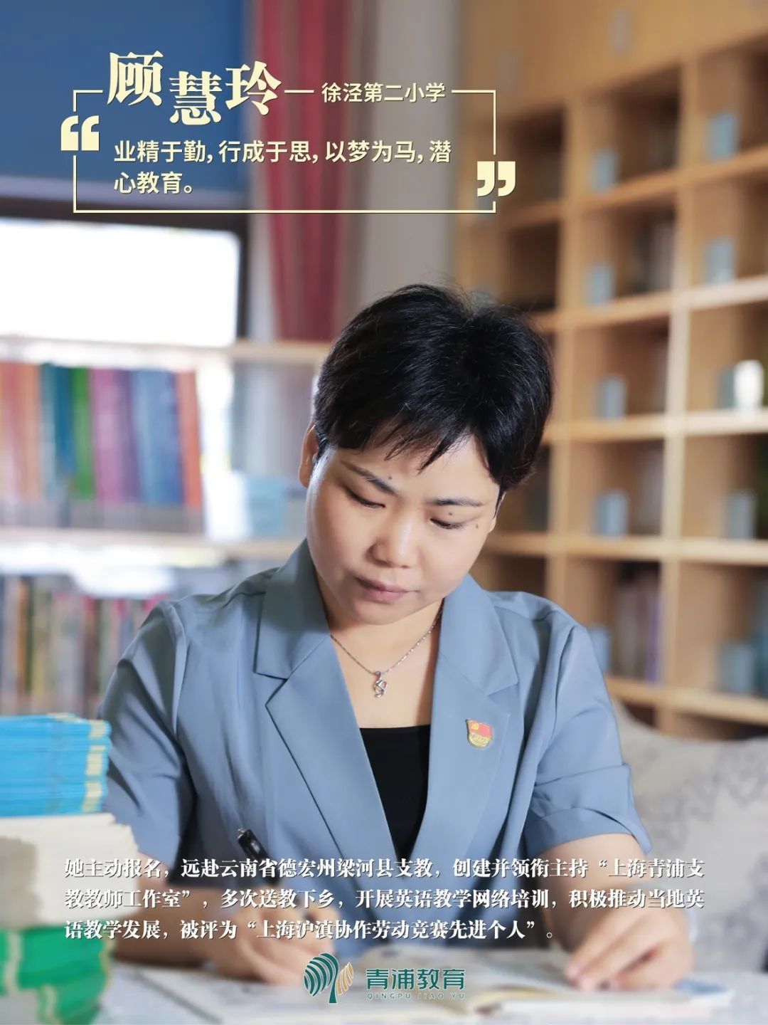 _ | 顾慧玲老师主动报名,远赴云南省德宏州梁河县支教,创建并领衔主持“上海青浦支教教师工作室”,多次送教下乡,开展英语教学网络培训,积极推动当地英语教学发展,被评为“上海沪滇协作劳动竞赛先进个人”。曾荣获青浦区“园丁奖”、青浦区教育系统“青藤奖”。 |
