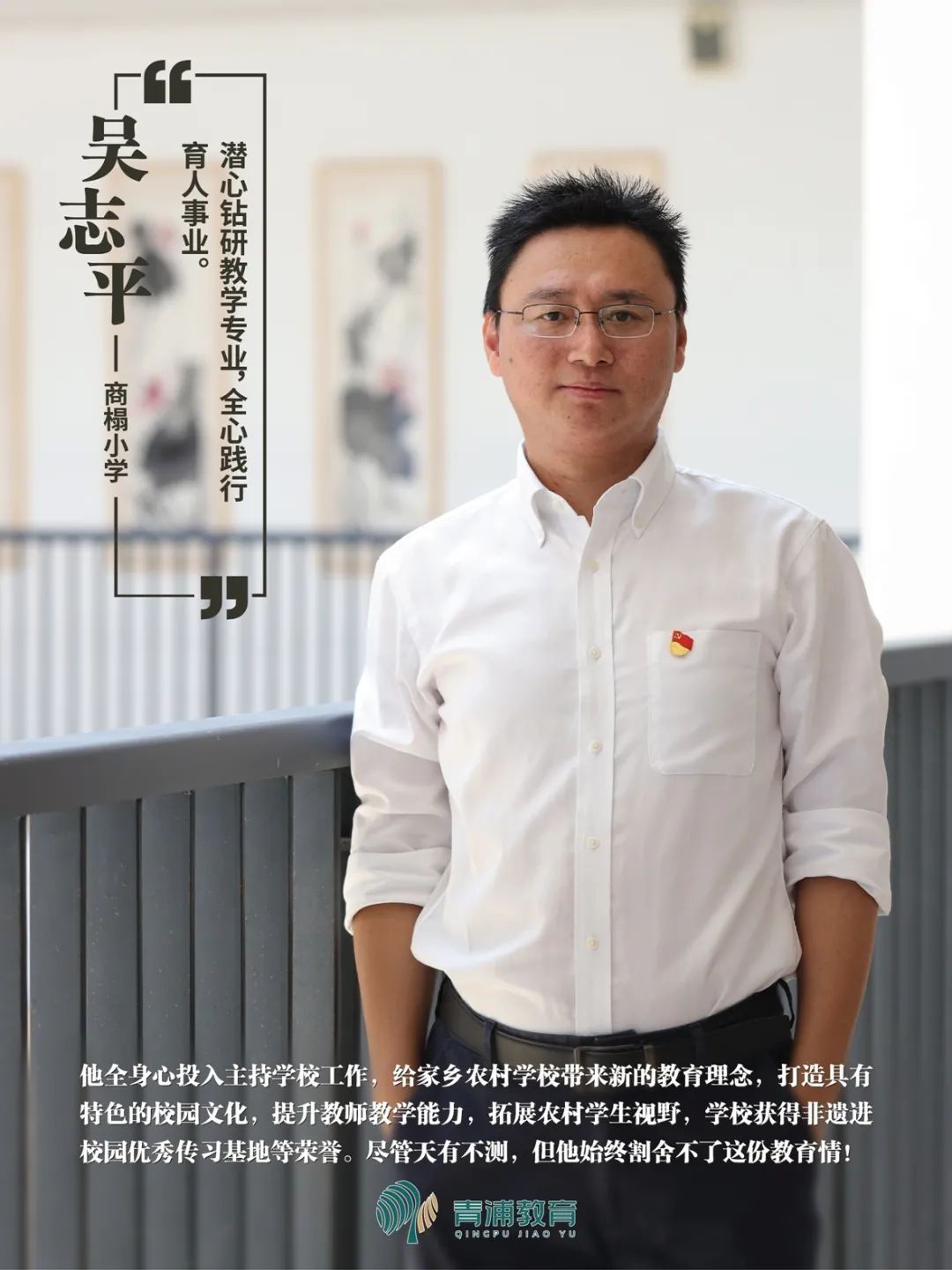 _ | 吴志平老师全身心投入主持学校工作,给家乡农村学校带来新的教育理念,打造具有特色的校园文化,提升教师教学能力,拓展农村学生视野,学校获得非遗进校园优秀传习基地等荣誉。尽管天有不测,但他始终割舍不了这份教育情!曾荣获上海市“园丁奖”、上海市教育学会“优秀工作者”、青浦区教育系统“优秀共产党员”。 | _ |
