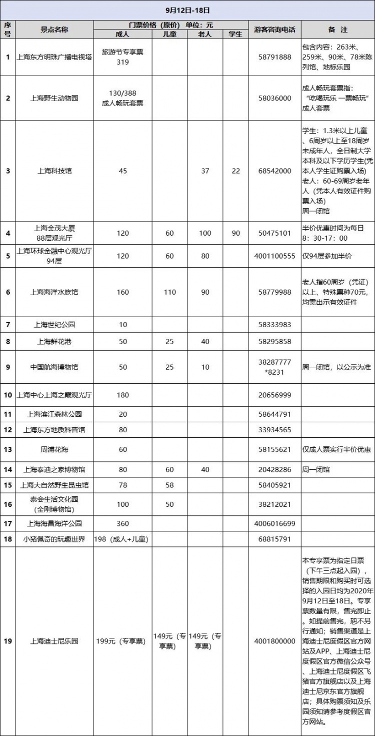 活动内容:旅游节开幕起的一周内,上海迪士尼乐园、东方明珠等20余家景点将参加优惠促销活动。