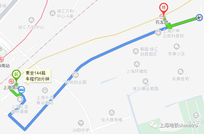 上海南站站至石龙路站:步行至南广场搭乘144路、上奉专线、南川线至石龙路东泉路站下车。