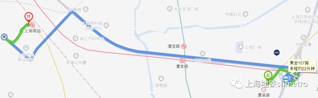 方案2:步行至漕溪路交通换乘枢纽乘坐157路至石龙路龙川北路(上海南站)下车。
