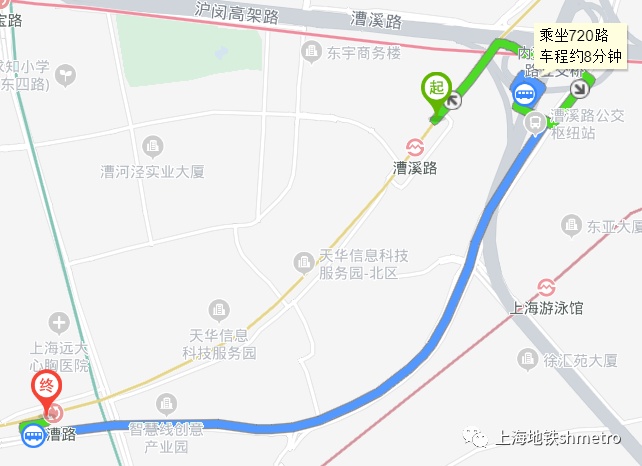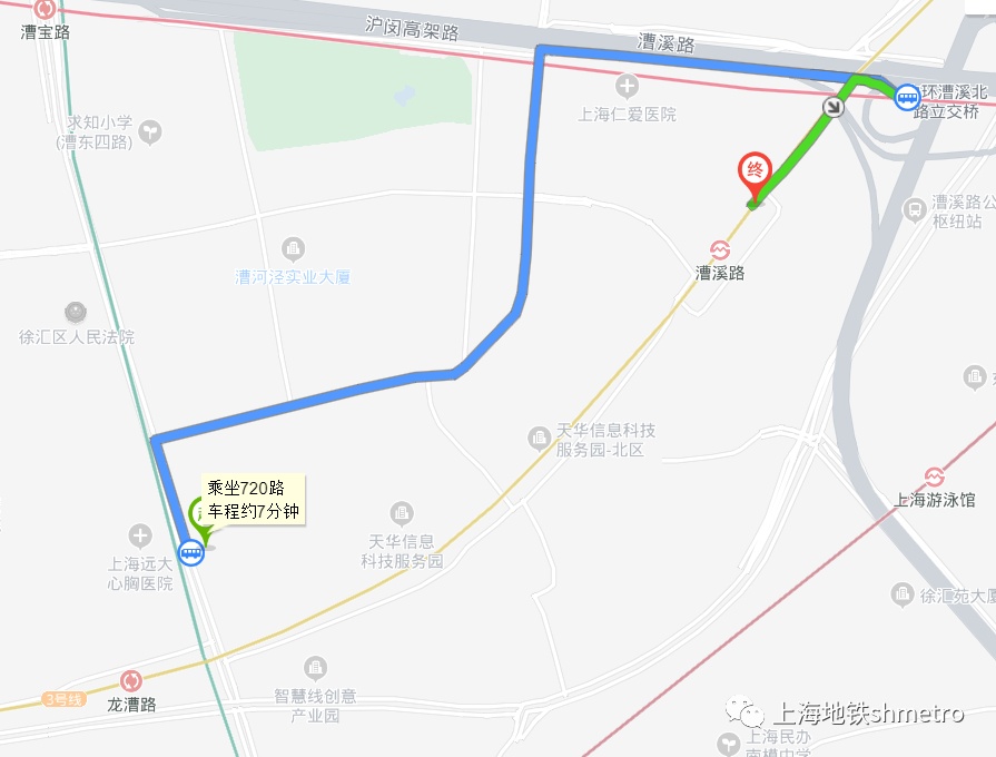 漕溪路站至龙漕路站:漕溪路公交枢纽搭乘720路至龙吴路龙漕路站下车。