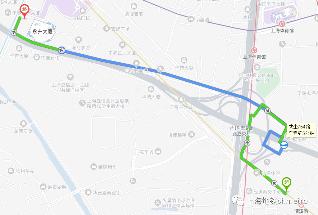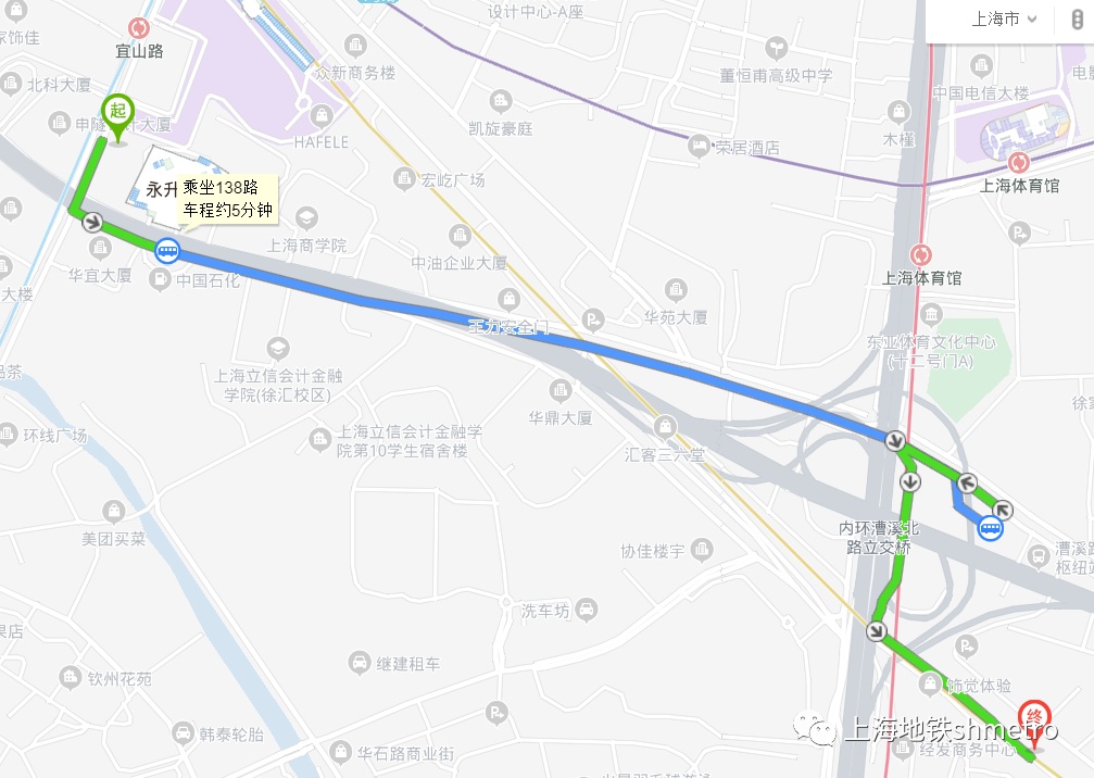 漕溪路站至宜山路站:漕溪路公交枢纽搭乘754、138、721路至中山西路宜山路站下车。