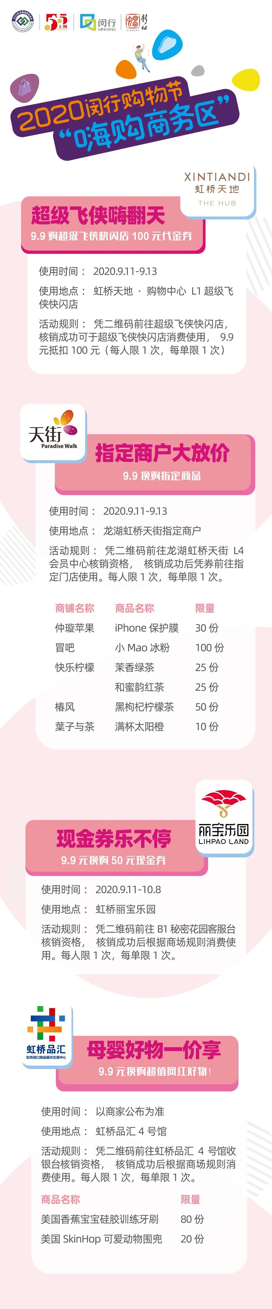 此次购物节,新虹街道联手商务区各大商业体,推出一系列促消费的活动。消费者登录“虹桥商务区云枢纽平台”,领取嗨购资格。获得资格后,前往虹桥天地、龙湖天街、丽宝乐园和虹桥品汇,就能以9.9元的统一价格,换购指定产品。