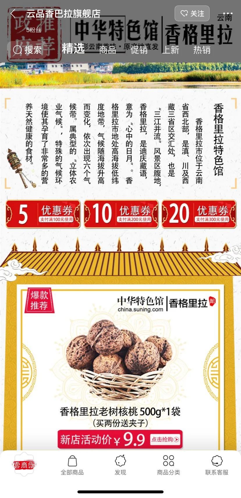 记者了解到,在苏宁易购APP里,找到“云品香巴拉旗舰店”,最新上线香格里拉高原牦牛肉酱、古树核桃、高原苦荞茶、尼西土鸡、白藜麦米等近40款产品,据悉,香格里拉季节性产品后续会根据产地的产品上市相应上架。