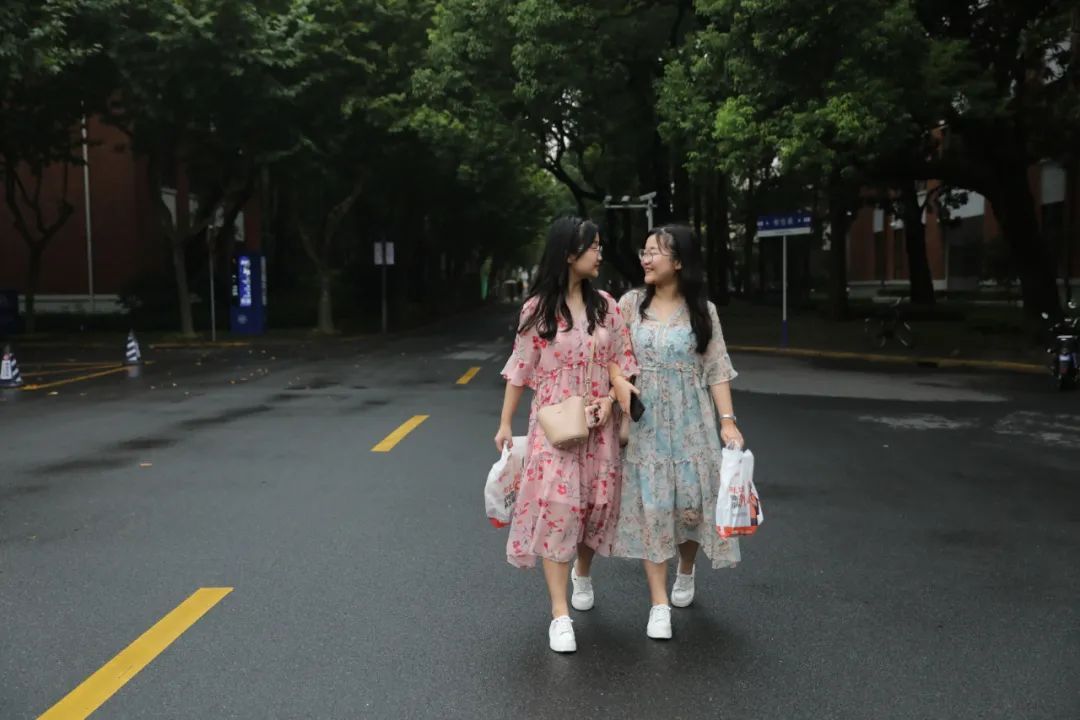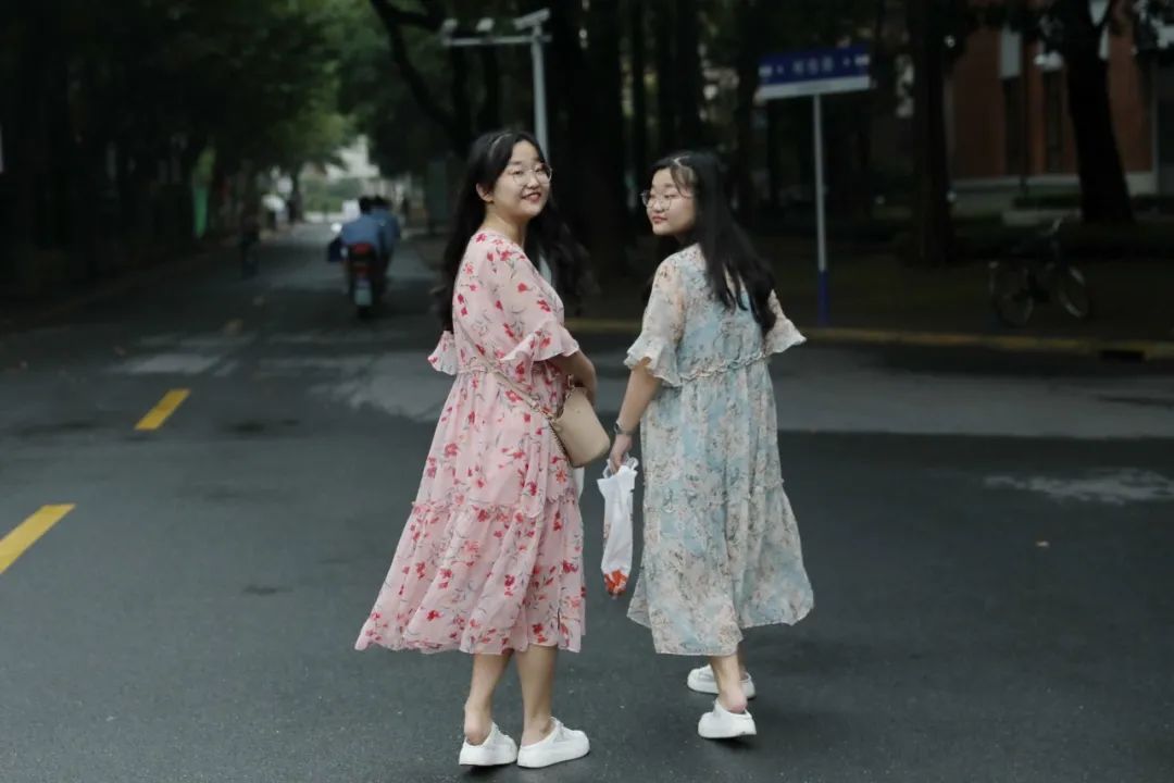 妹妹安蕾说,姐姐更爱蓝色,而自己喜欢红色,于是,她们就选择了身着同款不同色的连衫裙来迎接在复旦的第一天。