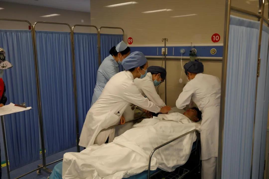 现场,1号伤员出现腹部外伤、肝破裂、腹腔出血、休克等情况,伤情十分危重。医护人员立即进行生命体征监测和各项急救操作,由于病情严重,急救人员优先让救护车将其送往医院急诊。