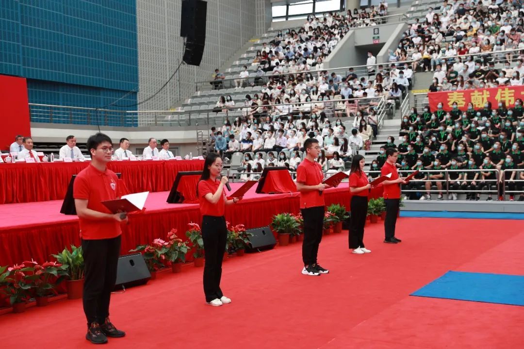 “胸怀远大理想,关注人类命运,忠于祖国,热爱人民,探求真知,遵纪守法,文明诚信,博学笃志,切问近思,追求卓越,恪守学术道德,弘扬复旦精神,为学校争光添彩,为国家贡献力量!”复旦大学学生会主席申景允、研究生会主席毛天婵带领全体新生,面向校旗庄严宣誓。
