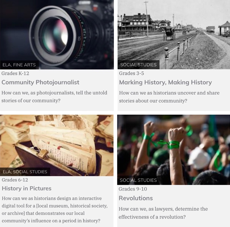 角色决定了学生要学习的专家思维方式。面对相同的任务,扮演的角色不同,完成任务的途径和运用的知识便有很大的差别。PBLWORKS 项目库中便收录了两个“相似”的项目。其一为“社区摄影记者(Community Photojournalist)”,驱动问题是“作为摄影记者,我们如何讲述我们社区不为人知的故事?”其二是“标记历史,创造历史(Marking History, Making History)”, 驱动问题是“作为历史学家,我们如何发现并分享有关我们社区的故事?”