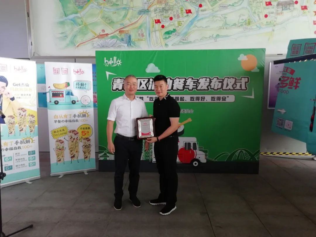 ▲副区长彭一浩为早餐车运行方——上海粮全其美公司颁发青浦区001号“流动餐车公示卡”。