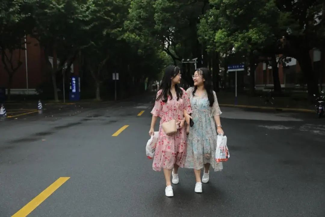 穿着连衫裙,加上同款编发、同款眼镜,安苒和安蕾双双来到梦寐以求的学府。妹妹安蕾说,姐姐更爱蓝色,而自己喜欢红色。成为复旦学子的第一天,她们分别穿上了自己喜爱颜色的衣服,开启新旅程。