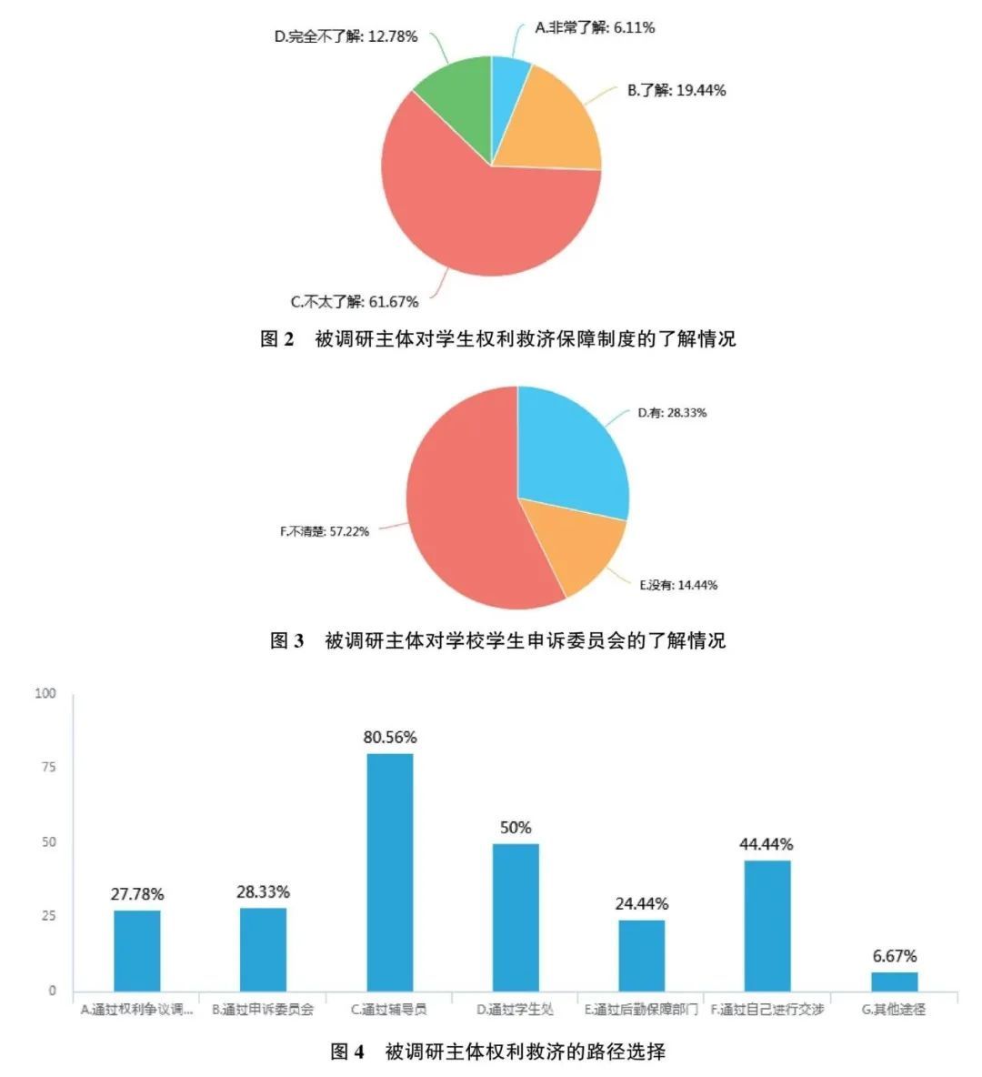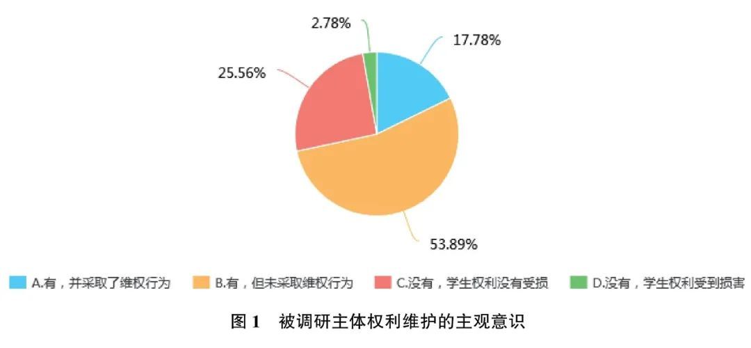 调研数据显示,53.89%的被调研主体有过维护自己权利的想法,但未采取维权行为;另有17.78%的主体采取了维权行为。应该看到,学生的权利意识正逐步增强。同时,对学生权利救济保障制度,有61.67%的主体表示不了解,57.22%的主体不了解学校学生申诉委员会的情况。关于维权的方式可以有多个选项,80.56%的主体选择通过辅导员,50%的主体选择通过学生处,也有28.33%的主体选择了通过申诉委员会。笔者长期担任校学生争议申诉委员会委员,2018年度参与了本校11位学生的申诉事务处理,本年度学生申诉事件的数量超过了之前五年的总和,从一个角度可以解读为学生主体的权利进一步觉醒,应该说提升公民的权利和法治意识也是国家法治化进程中的一条重要路径。