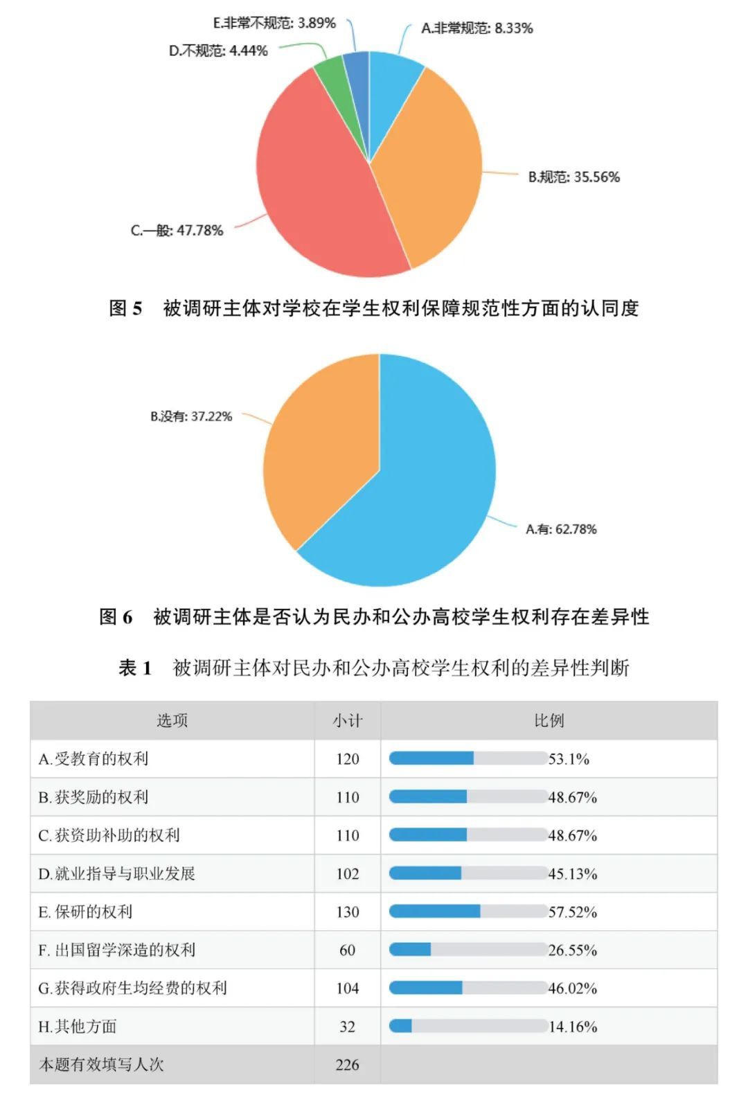 47.78%的被调研主体认为自己学校在学生权利保障方面的管理规范性一般,35.56%的主体认为比较规范;62.78%的主体认为民办高校与公办高校学生权利有差异,差异体现在受教育的权利、获奖励的权利、获资助补助的权利、就业指导与职业发展、保研的权利、出国留学深造的权利、获得政府生均经费的权利等方面,14.16%的主体补充说明差异还体现在民办高校学费昂贵、设备条件和师资力量不足、伙食补贴较低,以及其他方面。