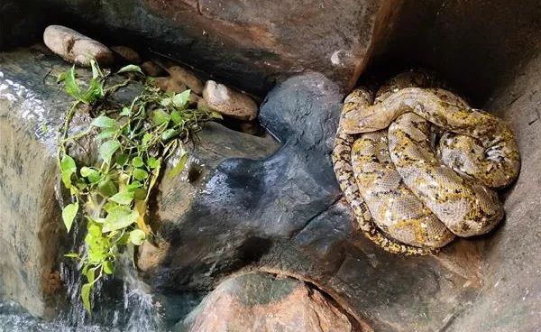 幸亏网纹蟒摆好威风之后找到了自己的“地盘”,目前这条“大家伙”已经适应了新展区,起居饮食均正常,并蜕了一次皮。它最喜欢趴在瀑布旁的岩石上,兴致来了也会在水池溪流中游历一番,运气好的话还能看到它表演爬树呢。