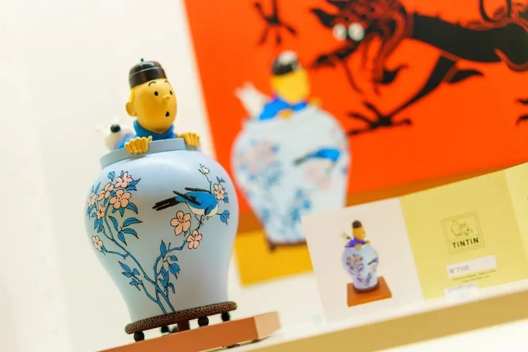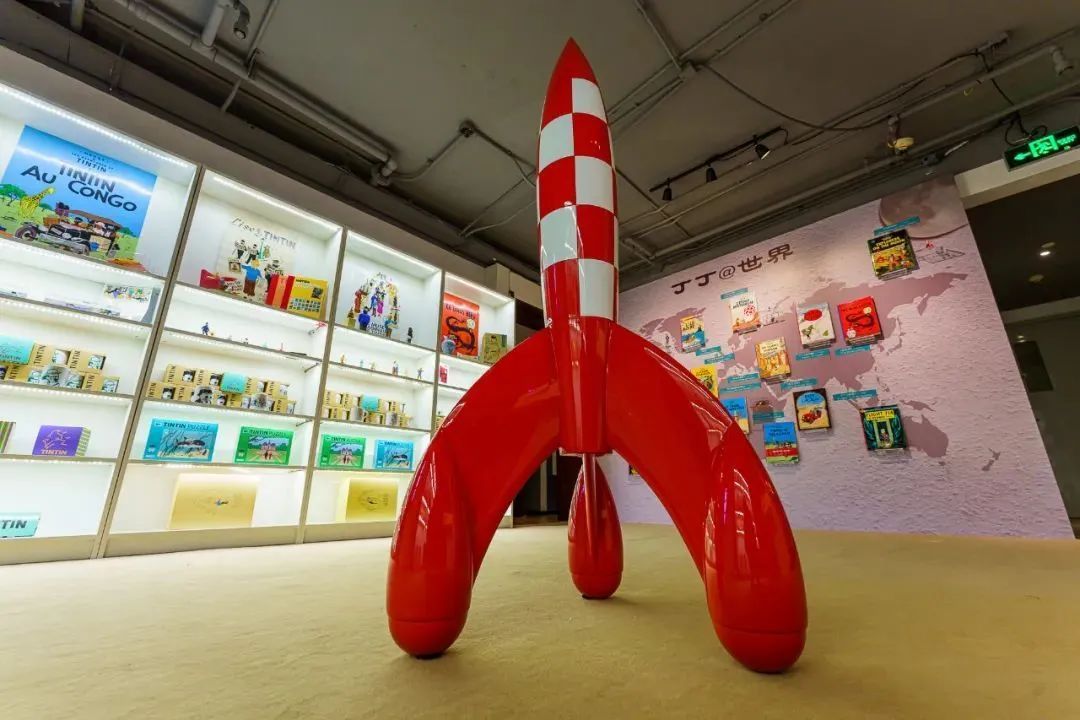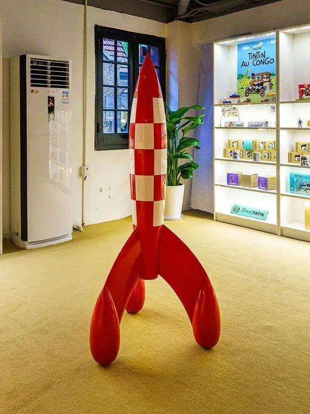 除了全球性的限量珍品,里面还有不少收藏级的手办。各种规格的登月火箭,珍藏版的人物雕塑,向日葵教授发明的鲨鱼潜艇,丁丁坐在自己家的红沙发里。