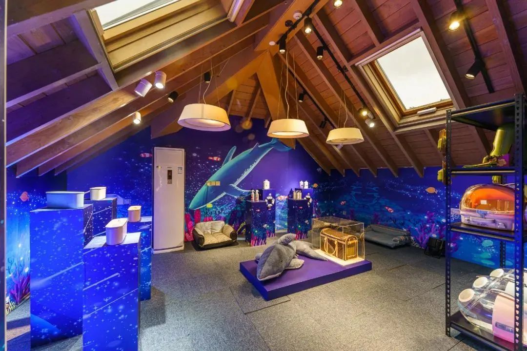 海底世界则是蔚蓝色为主,来到这里仿佛置身海底世界。靠近墙面,摆放着宠物专座迷你沙发,超mini的size,可爱极了!
