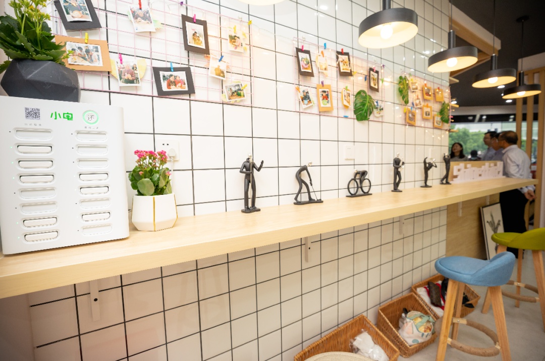 慈善超市里还有一排座位是面向所有人开放的,也是户外职工休息补给站,大家可以在这里倒上一些热水,使用微波炉热一下饭菜,给手机充电,休息一下。