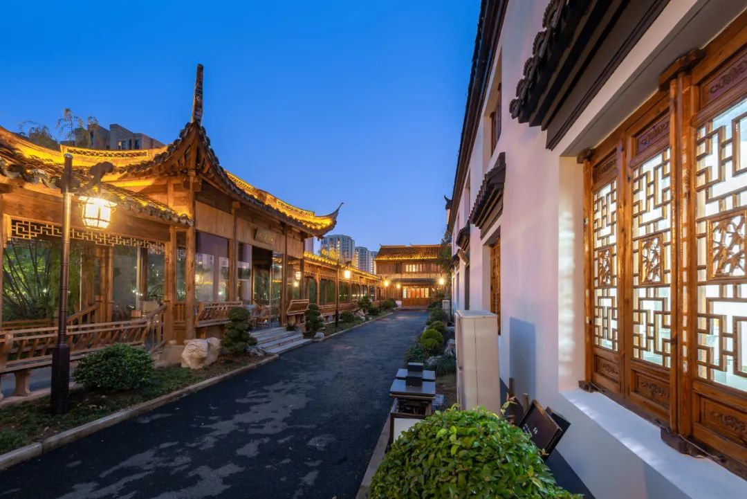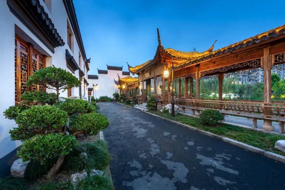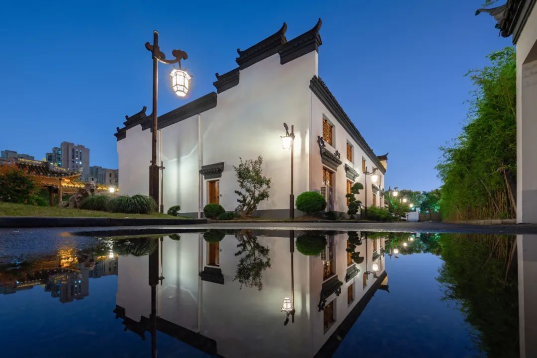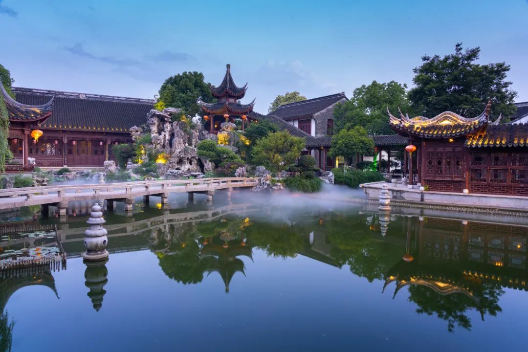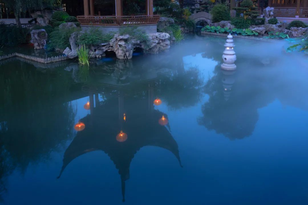一侧繁华,一侧宁静。和老街一墙之隔的檀园、云翔寺夜色如水。薄薄的水雾趁着夜色从檀园七曲桥畔缓缓浮起,微黄的灯光映照在水中,红彤彤的灯笼静默在飞檐翘角上。硕大的锦鲤在水中打个旋,水波咕嘟一声闷响,慢慢的涟漪散开去,夜色就又浓了一分。