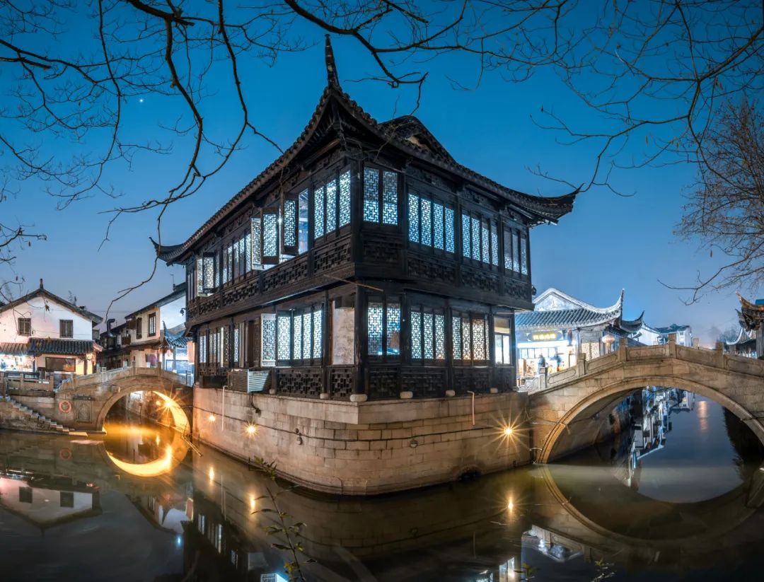 八字桥上,几点星光挂在枝头,一弯拱桥在水面倒映成圆月。行人从桥上走过,伴着吴侬软语,时光也似乎顺着八字桥下的河水,慢悠悠的就这样溜走了。