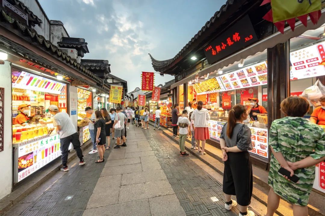 老街的天空呈现出浅紫、暖橘、淡红、湛蓝的色调,头顶是天空的绚丽,脚下是生活的五彩,街边各色小吃的香味,和着人群的喧闹鼎沸,熙熙攘攘的人间烟火气让南翔的夜色可近又可亲。
