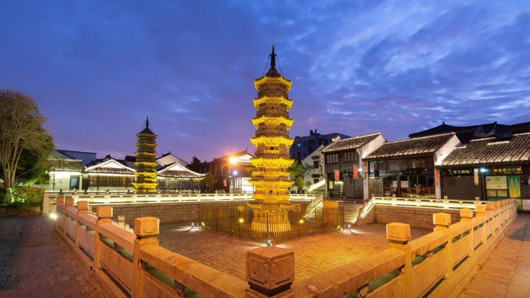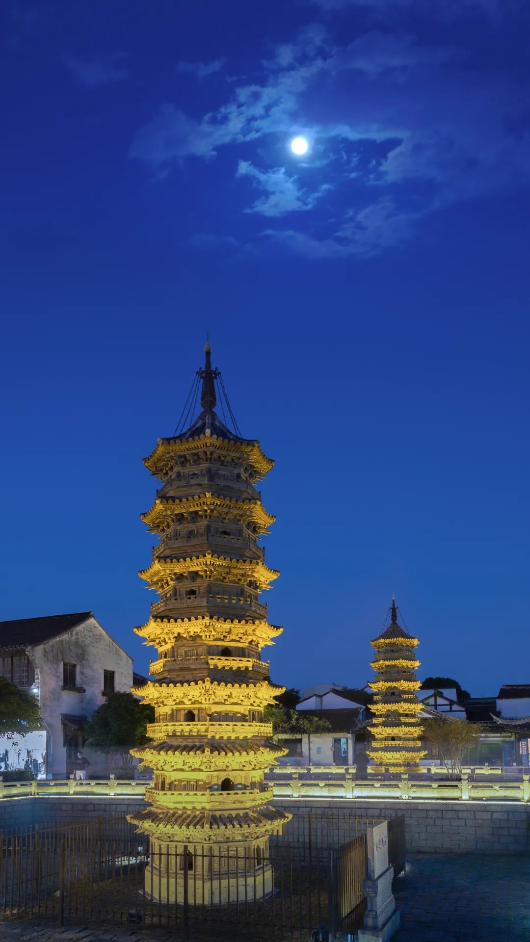 怎么能不先去看老街的夜色呢?将暗未暗时,深蓝的夜空中还有一抹晚霞,双塔被金色的灯光浸染,塔顶的一轮圆月晕出淡淡的光。
