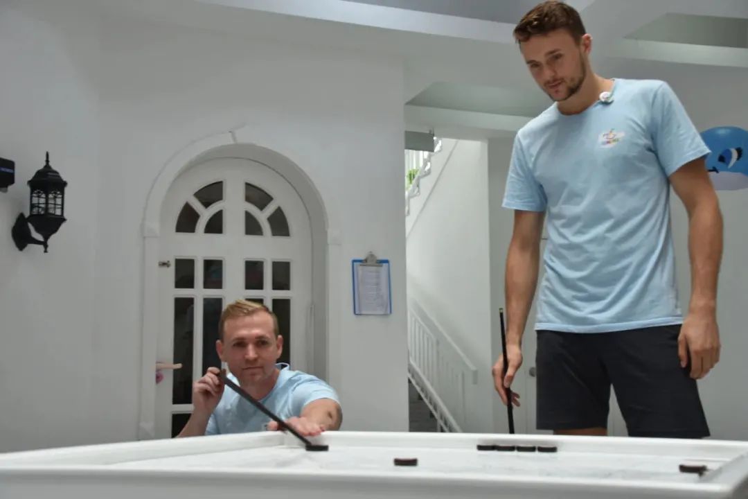 5、运动员比赛前双方对康乐球盘水平面有异议,允许提出,由裁判员试打确实存在异常后重新调试;比赛开始前,通过掷硬币决定运动员选择康乐球盘站立位置和开球权,整场比赛站立位置不得更改;从第二局开始,开球方为上一局胜者;