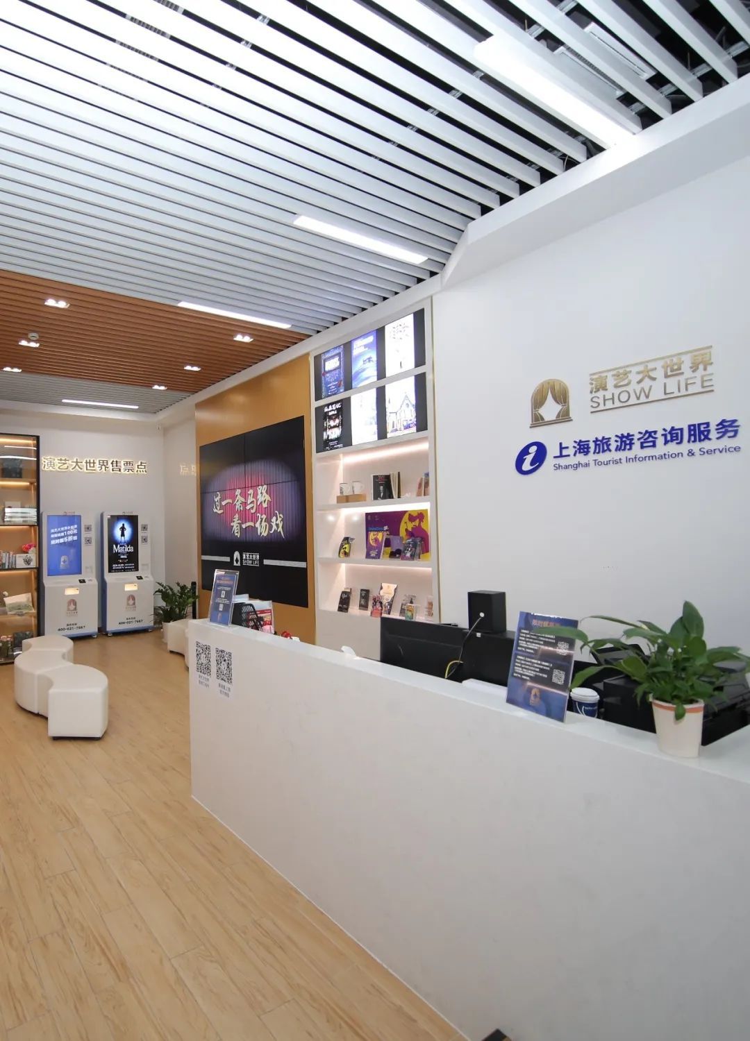 在这里你可以了解最新的演出资讯与上海文旅攻略,展架上陈列的演艺地图、观剧手账、各类剧场与演艺大世界文创产品让人眼花缭乱,两台“演艺大世界”自助售票机可以购买到惠民补贴票,时不时还有可能遇到各种活动!