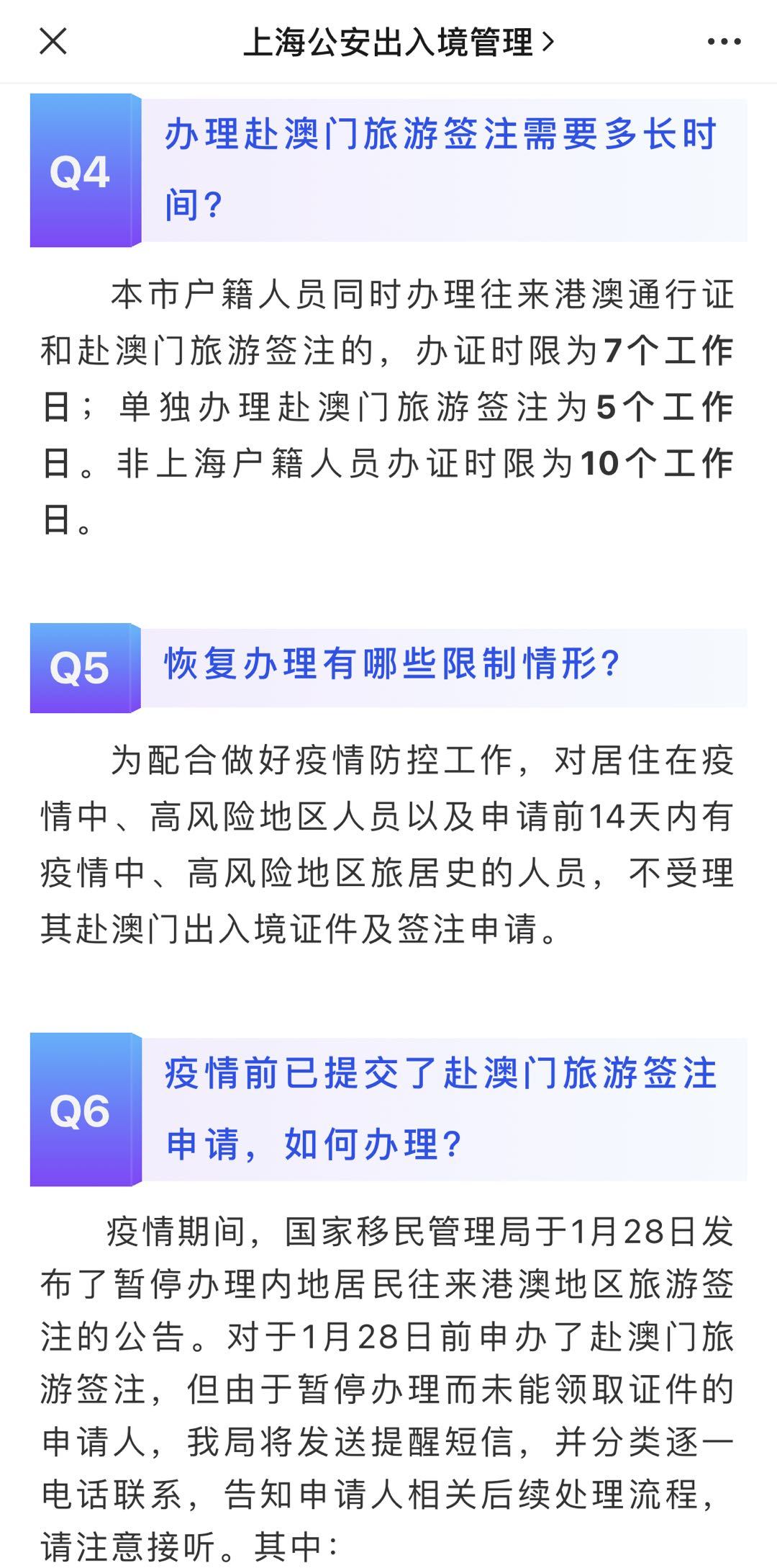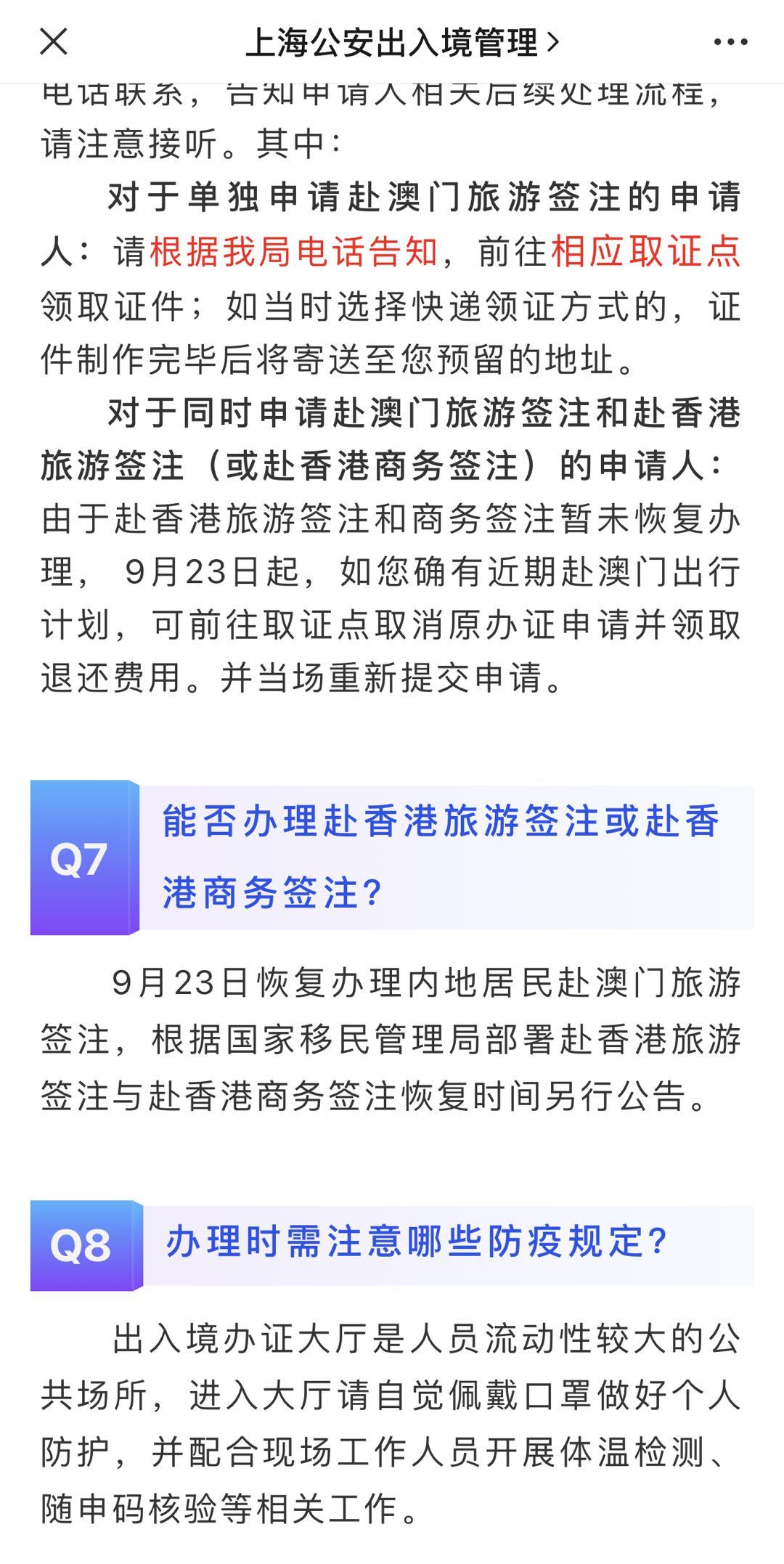 此外,对于此前已经申办了单独赴澳门旅游签注的申请人,可按照电话告知前往相应取证点领证。对于同时申请赴香港、澳门旅游签注的申请人,由于香港旅游签注业务尚未恢复,领证时间需等待进一步通知。