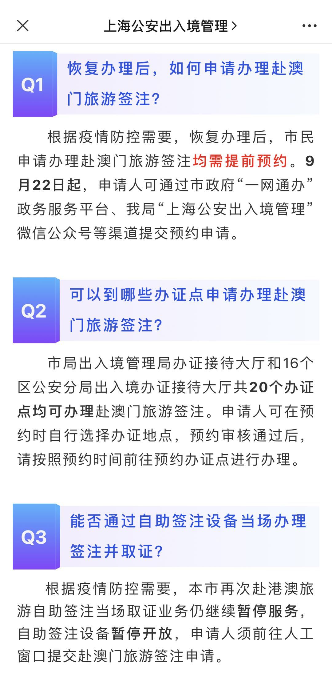 根据国家移民管理局的相关政策,本周三(9月23日)将重新开放澳门旅游签注业务,加之正逢中秋、国庆双节前夕,工作人员也已经对于可能出现的客流增长做好了人员配置和加班加点的准备。要提醒大家的是,市民申请办理赴澳门旅游签注均需提前预约,周三全市各网点均不接受现场受理。9月22日起,申请人可通过“一网通办”或“上海公安出入境管理”微信公众号提交预约申请。