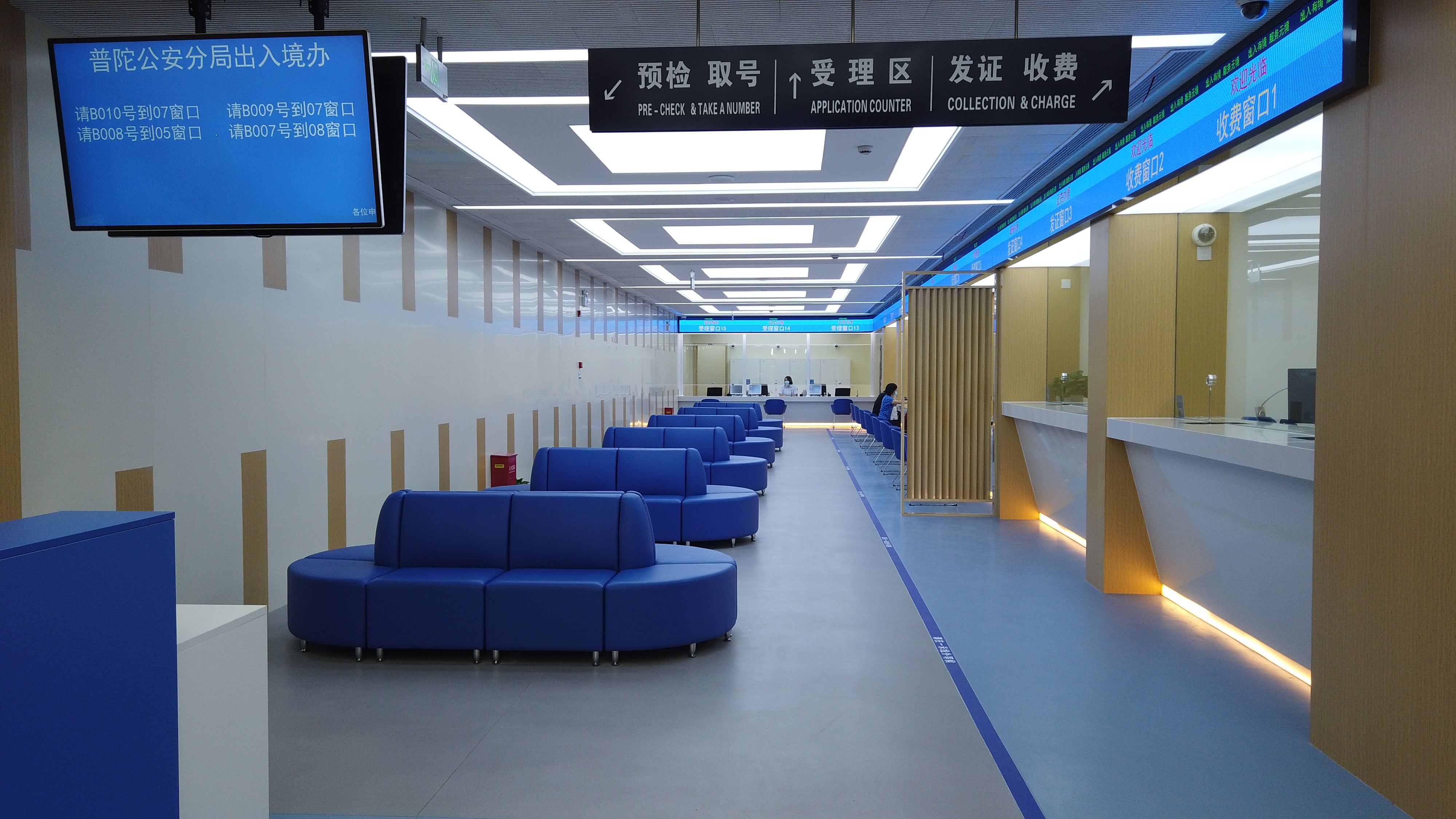 在人工办理区,新址采用了无声叫号系统,等候人员排队取号后,大屏会实时显示排队人员的叫号情况,后台系统也会以手机短信的方式告知当事人剩余等候人数,以及相对应的受理窗口号码。前来办证的市民邹先生觉得,无声叫号系统有利于营造安静的排队等候秩序,另一方面,能实时查看自己的排队序列也利于等候市民合理安排自己的时间。在全面采用自助办理、自助取号的同时,现场还同时配备人工导引服务,为一些中老年人提供传统的排队引导服务。普陀公安分局出入境管理办公室副主任郑轩介绍说,对于一些不适应自助化操作的上了年纪的市民,他们在现场划出了一片专门的区域供他们等候休息,工作人员会观察屏幕显示,当叫到了相应序号时,工作人员会上前进行提示并引导前往相关窗口。