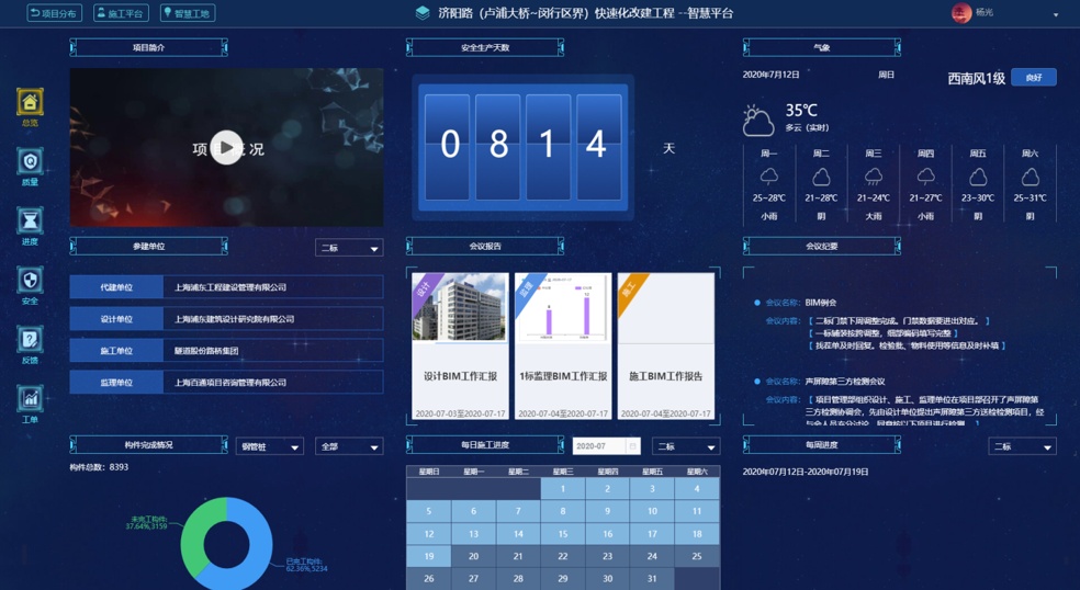 作为浦东地区中环和外环之间重要的快速连接通道,工程伊始,项目部就制定了高架桥梁工程BIM实施导则和数据标准,并将设计阶段BIM模型100%传递到施工阶段,统一各方实施应用,基本实现事先策划,过程控制,成果验收的闭环管理,济阳路快速化改建成为新区首个全面采用预制拼装与BIM技术相结合的大型市政高架改造工程,通过布设现场物联网硬件设备,深度开发整合形成了项目智慧平台管理体系。