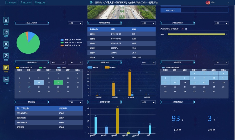 复杂节点施工可模拟,工地人员进出可识别,现场环境可实时监控……济阳路快速化改建工程积极打造智慧工地,打造基于BIM(建筑信息模型)全生命周期智慧管理平台,在工程施工中实现对人员、机械、材料、施工工艺等多要素的智慧管理。